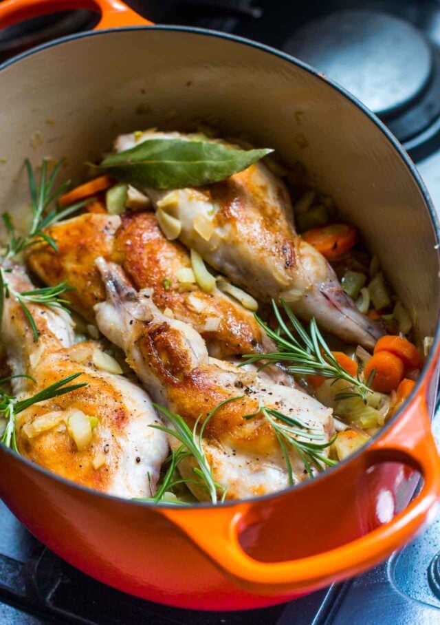 - Remove the thighs from the pot and add the onions, carrots, fennel and garlic and cook, stirring frequently, until the aromatic vegetables are cooked through, about 5 to 8 minutes. If necessary, add a bit more duck fat or olive oil if the vegetables are burning. Once the vegetables are cooked, add the rabbit thighs back to the pot along with the rosemary, bay leaves, and water. Cover and braise in the oven for 1 1/2 to 2 hours, until the rabbit is very tender.
