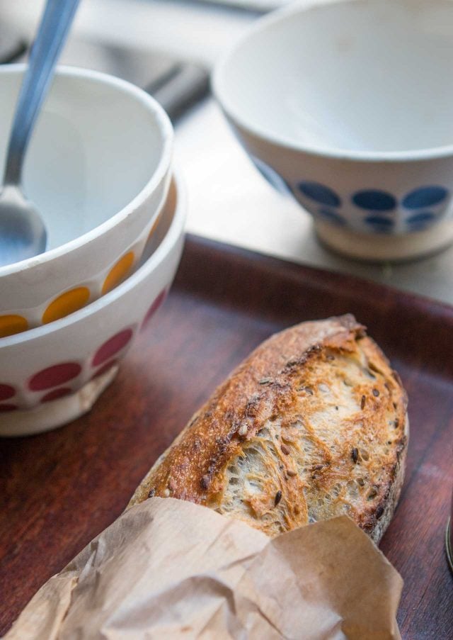 Going to a bakery, in addition to having fresh produce, has become another thing that feels like a luxury. Iโve had quite a few close calls with โspace invaders,โ as somehow, a number of others havenโt gotten up to speed on social-distancing guidelines and the rules are elusive (or donโt seem to apply**) to them. So going out has become too much of a challenge for me, as I remain cautious. Romain is a champ, though, and will risk it all for a baguette, and for me. And thatโs something Iโve become extra-appreciative of, too.