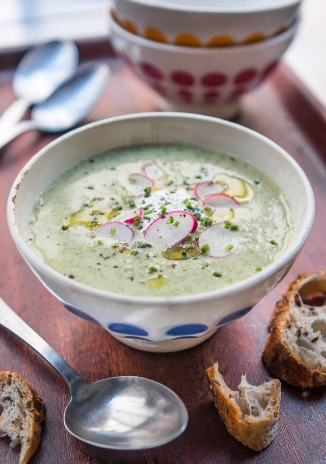 Itโs one of those foods that was born out of the idea of using everything and wasting nothing. Like โnose-to-tailโ cooking, this would be โroot-to-leaf.โ All parts of the radishes are used, from the spindly tips of the radishes to the mildly peppery greens sprouting off the tops of their heads. The meaty radishes themselves can be sliced and served over the finished soupe, or veloutรฉ, since I find a touch of cream smooths out the soup nicely and carries the flavor nicely through the bowl.