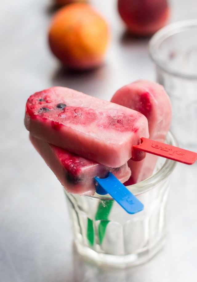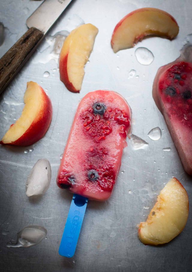 The popsicles made with white nectarine puree, dotted with tangy raspberries and blueberries, turned out great and were very refreshing to have during last weekโs heatwave. I used white nectarines but really, you can make them with yellow nectarines, peaches, apricots, plums, or melon. For the molds, two cups (500ml) of popsicle mixture was the perfect amount, but check the capacity of yours; if your popsicle molds are larger, the recipe can be increased accordingly.