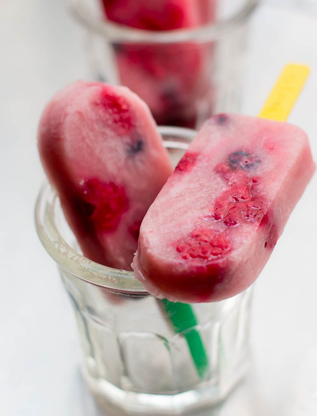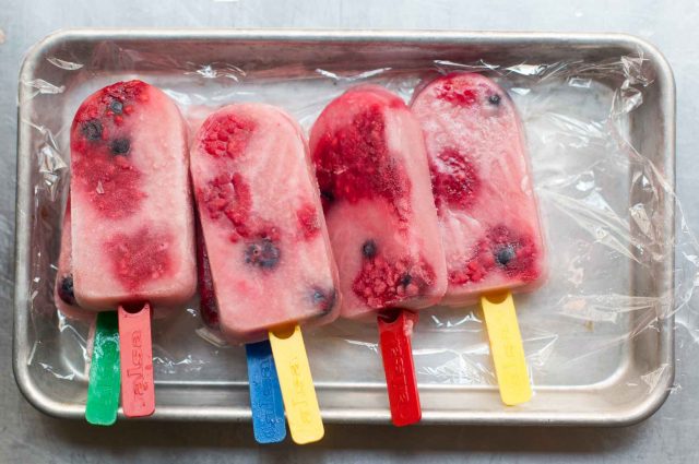 - To make the popsicles, toss the berries with the remaining 1 teaspoon sugar and maraschino liqueur (if using), using your fingers to slightly mush the berries up a bit. Not only will that help the sugar and liqueur get into them, but it'll make some streaky swirls in the popsicles.