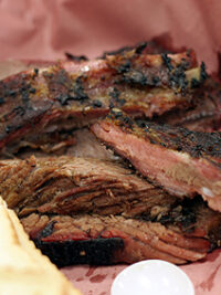 When all was said and done, and weighed (which fortunately, wasnโt me on the way outโฆ), I realized that Iโd ordered over a pound of ribs and a pound of sliced beef. If I had only had the ribs, I wouldnโt have been as excited. But the brisket โ yo, bro, the brisket! When he asked me if I wanted โLean, or moist?โ, Iโd instinctively answered โMoistโ, which was obviously the correct answer. The muscular shoulder clod was, indeed, muscular. But each slice of beef brisket was juicy, pull-apart tender, and clearly well-worth the drive. Or even a six mile walk.