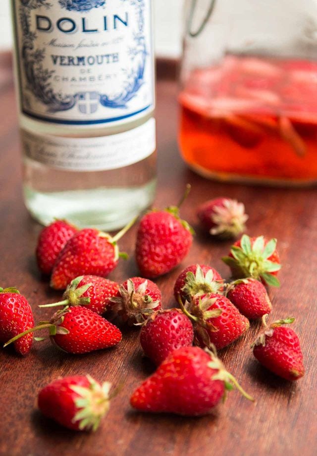 - To make the strawberry-infused vermouth, pour the vermouth in a clean jar. Add the strawberries, cover, and shake gently to encourage the strawberries to lend their flavor to the vermouth. Let stand 24 hours at room temperature out of direct sunlight, giving it a shake every so often.