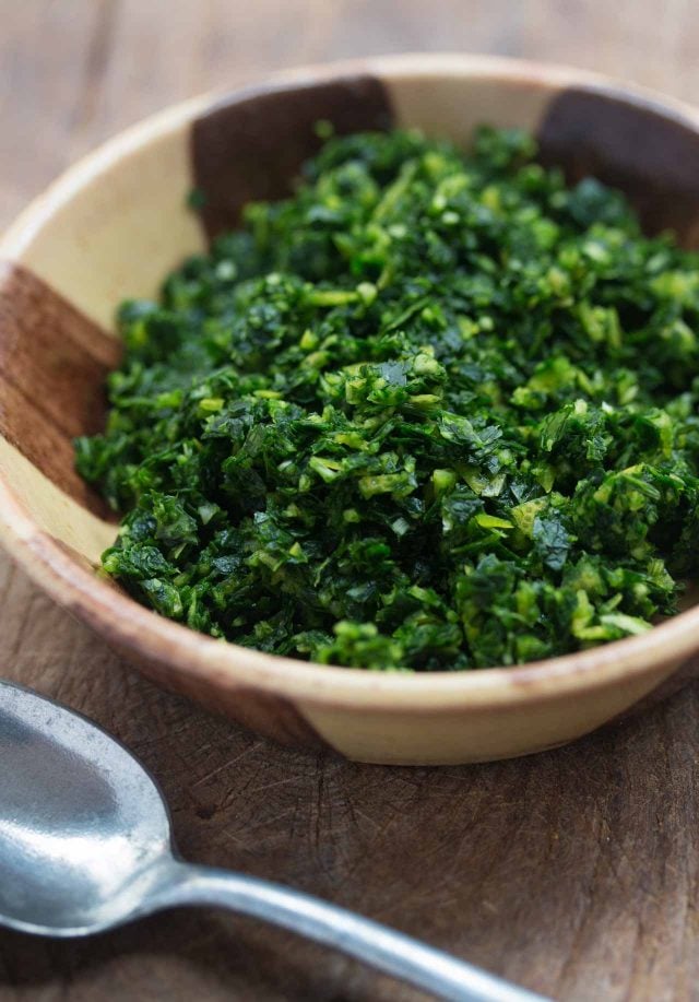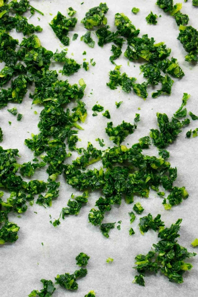 - Add the lemon zest and continue to chop until the parsley, garlic, and lemon are well-combined. If the gremolata is too damp, spread it on a baking sheet or platter for an hour or so, to dry at room temperature.