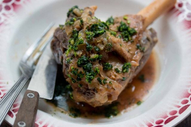 I was out shopping for ingredients for a day of recipe testing last week and since weโre in the midst of winter at the moment, I thought itโd be nice to have lamb shanks for dinner. Theyโre easy to prepare; you just stick them in the oven for a few hours with some aromatics and wine or stock (or water, or whatever you have on hand), and then you can almost forget about them. Theyโre hard to screw up, and the bonus is that the oven warms up your kitchen nicely.