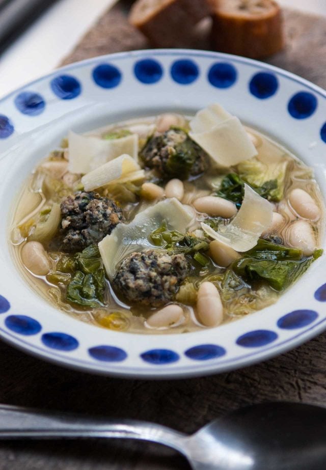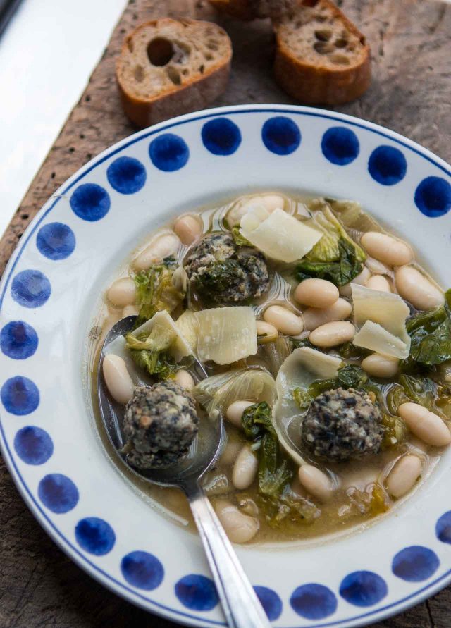 This recipe isnโt French, but Italian-influenced,ย a take on Italian Wedding Soup. Itโs a simple broth-based bowl of escarole sautรฉed in garlic, beans, and meatballs, which is hearty and warming. I was sort of not in the mood to make a fuss, so poached the meatballs in the soup rather than cooking them separately, although a few fell apart, which didnโt bother me. (Anything with less clean-up in the kitchen never bothers me.) But you can fry or bake them in advance, and add them at the last minute. Itโs a great soup to get you through the winter, a wedding, or an overactive purchase of greens.