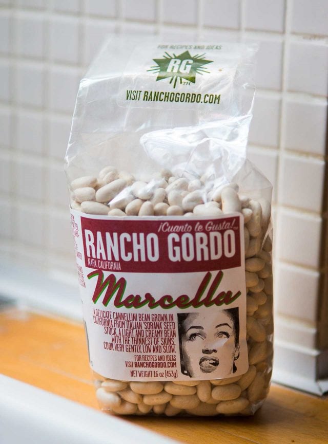 To even further my status as an effective multitasker in that department (I should write a Marie Kondo-like book, The Life-Changing Magic of Using Things Up),ย I also had a bag of these much-heralded Marcella beans from Rancho Gordo that I brought back from the States. People ask me where they can get them in France, and you canโt. But the good news for those who are Stateside is that Steve, the owner, is offering some French varieties of heirloom-type beans. His cassoulet beans are excellent, heโs got flageolets, and heโs now carrying Mogette de Vendรฉe beans. (He also just published French Beans: Exploring the Bean Cuisine of France byย Georgeanne Brennan.)