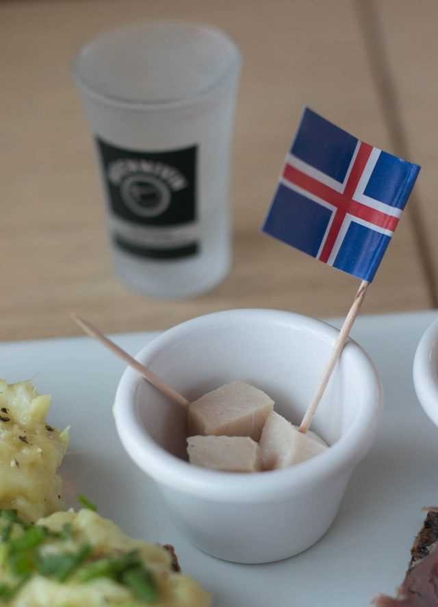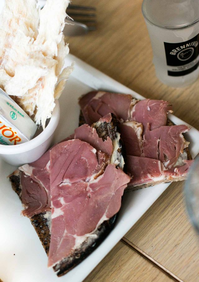 The fermented shark was interesting and ownerย Hrรถnn Vilhelmsdรณttir told me not to smell it first, before eating it. Just to pop it in my mouth, and follow it with a shot of Brennevรญn, Icelandic schnapps made from potatoes and caraway. (The shark is buried for 2-3 months, then hung to dry for several weeks, or months.) The reason our noses are above our mouths is to prevent us from eating stuff thatโs funky or spoiled, and in this case, I did inhale briefly, but quickly popped the cube of shark into my mouth before following it with a shot of the bracing โ and cleansing โย snafs.