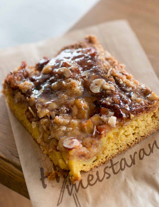 Sigurรฐur is an avid collector of baking books, some of which lined his office, but I suspect at home, heโs got some baking tomes that would make the rest of us weep with envy. Kind of like I felt when I saw this Eplastykki (below), covered with nuts and caramel.