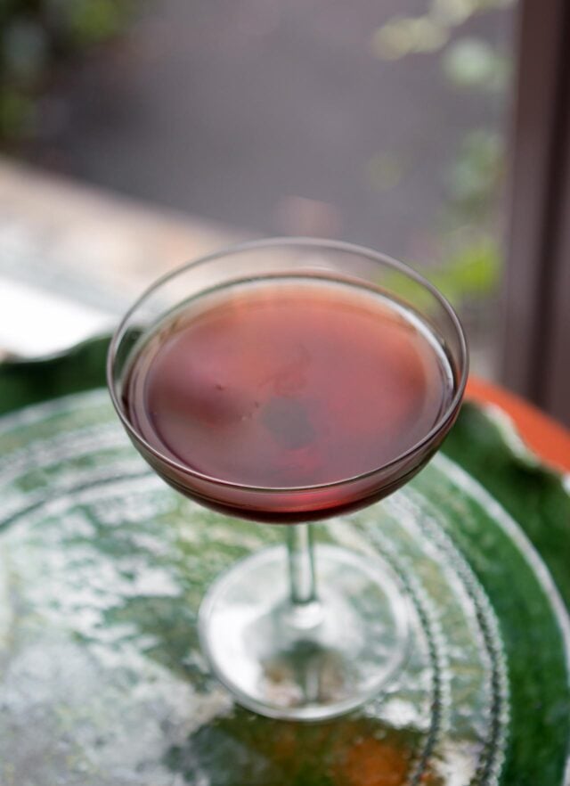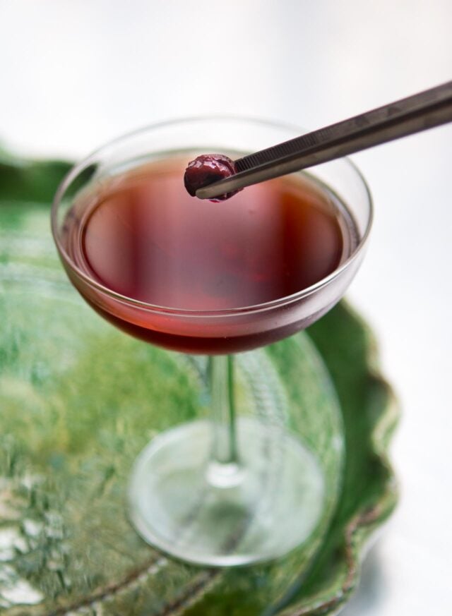 - Fill the glass three-quarters full with ice cubes and stir briskly until well-chilled, about 15 seconds. Strain into a chilled cocktail coupe. Garnish with cherry.