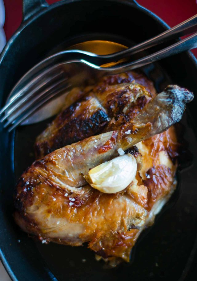 Our Brouilly was rich enough to stand up to the steak-frites that Romain had, but also went well with the roast Challans chicken that I ordered, as it wasnโt too demanding or overwhelming.