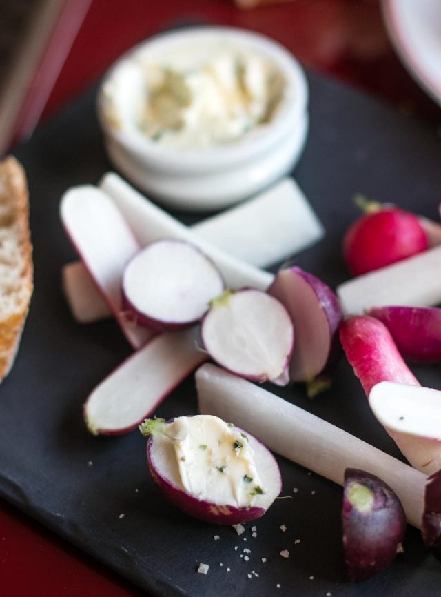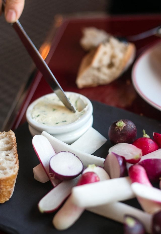 On one of my first visits, we had the radishes with butter, a popular starter in France, although usually not served in restaurants due to its humble nature. Hereโs itโs given a more modern treatment with a colorful pile of radishes, a ramekin of silky chive butter, and grains of flaky sea salt to sprinkle over them.