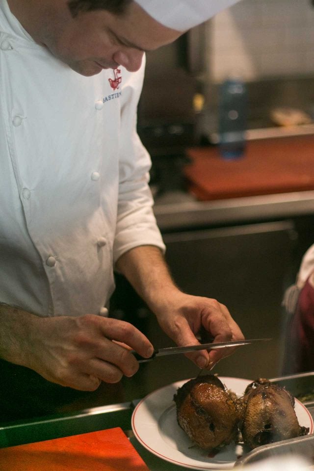 Because the restaurant sports anย open kitchen, I got to talk to the chef on my second visit. He was presiding over the turning rรดtisserie, slicing a pair of roastedย canettes (duckings). Known for their pressed duck at the fancy restaurant (diners get a certificate with a number on it, as a memento), itโs just as popular at the bistro. And they do a great job with it at a fraction of the price.