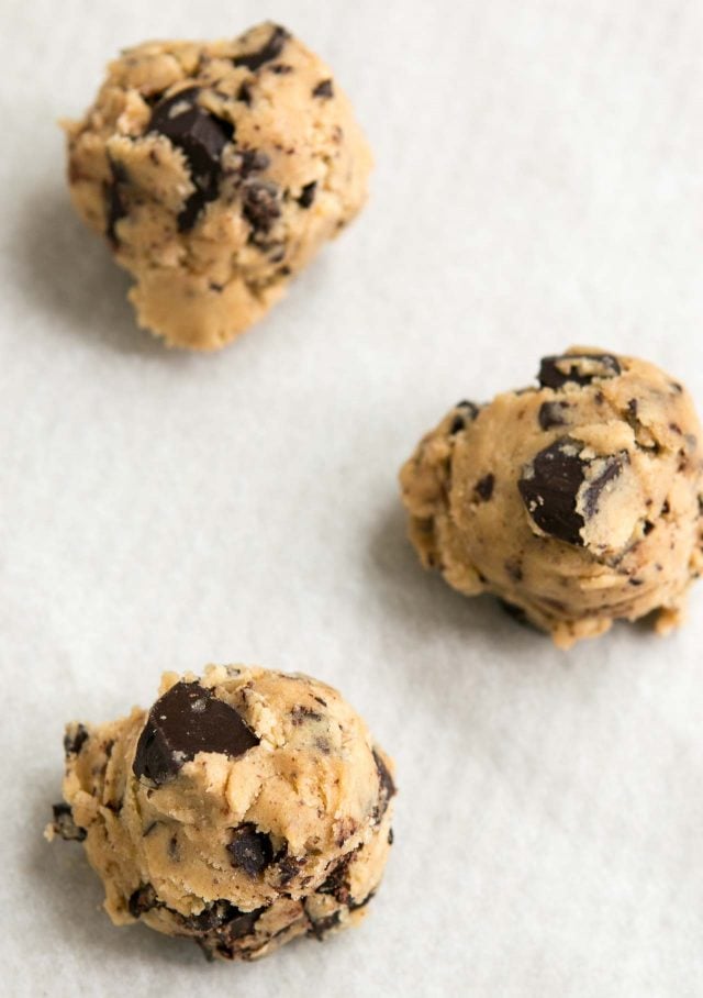 - Form the cookies into rounds using an ice cream scoop, or your hands. For small cookies make each 1 1/2-inch (3,5cm), for larger cookies, make them 2-inches (5cm) round. Place them evenly spaced on the baking sheets, 3-inches (8cm) apart). Bake one sheet at a time, so you can keep an eye on them, in the middle rack of the oven.