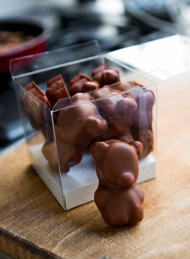 Even more fun was the marshmallow teddy bears, a wink atย Oursons guimauve, beloved by the French, and sold in supermarkets. Theyโre meant for kids, butโฆwell, I canโt resist them either. If I lived closer to Sandrineโs workshop (which is open to the public), Iโd be a regular customer. Perhaps itโs better I donโt, because a couple of days after we got home, Romain asked me what happened to all the chocolate-covered marshmallow bears, and, as in the words of George Washington, I cannot tell a lieโฆ