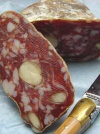 So bundled up in our wool coats, sweaters, long underwear (me), thermal shirts, gloves (him), a hat (him: I look funny in hats), mitten (me: my hands get cold, I donโt care how funny I look), and scarves (both), we wandered the market, first stopping at the stall with my favorite women from the Savoie, the mountainous region encompassing France and Switzerland, home to many of the finest sausages (and Comtรฉ cheese as well.) As we perused the piles of dried and fresh sausages, his explanation was this; โSaucisse is any little sausage, fresh or dried. Saucisse seche is the term used when itโs dried. Saucisson is any sausage thatโs dried, but big.โ