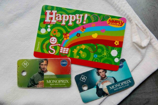 To stay in everybodyโs good graces, Iโve gotten fidelity cards from several grocery stores in Paris (above), which I use, but Iโm still unclear as to why they give them out since Iโve never seemed to have gotten anything from them. (Also unclear: Why โHappy!โ is written in English, rather than French.) They donโt give you a discount at the register, or โcash back,โ or anything like that. But the cashiers keep asking me if I have one at the check-out and I want to stay on their good side, so Iโve become a card-carrying member of them all, because I never know when I might want to buy something, and need a littleย service clients when I do.