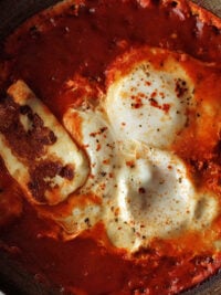 Since itโs probably going to come up, I donโt imagine zaโatar is traditional in shakshuka. But since dried yeast wasnโt traditionally added to bread, since youโre already taking liberties, you get a pass with the sauce seasonings and you can customize it, adding ground coriander, paprika, or caraway for a little extra pizzazz, or use the seasonings I use to make shakshuka. (Since that recipe uses two cans of tomatoes, you can cut the spice amounts in half to use in the recipe here, which calls for one can of tomatoes.)