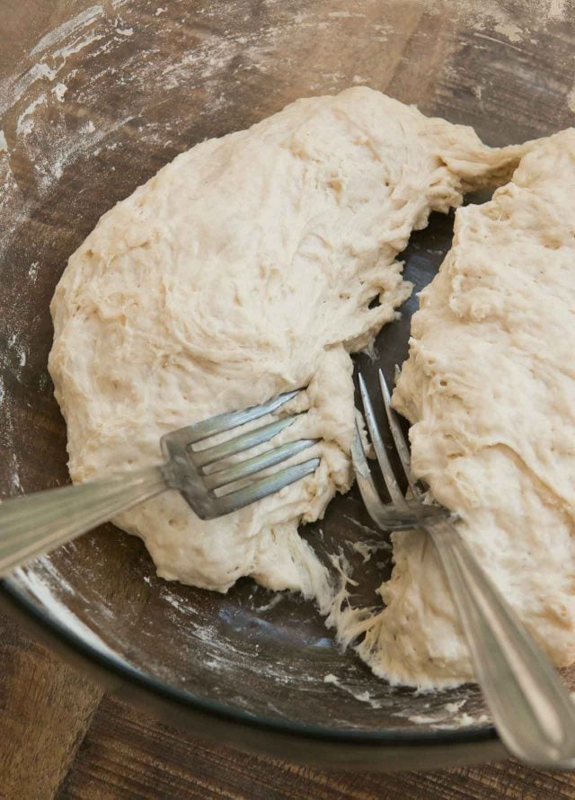 - Using two forks, scrape the dough from the edges of the bowl toward the center, to deflate it, then use the forks to shape the dough into a rough ball.
