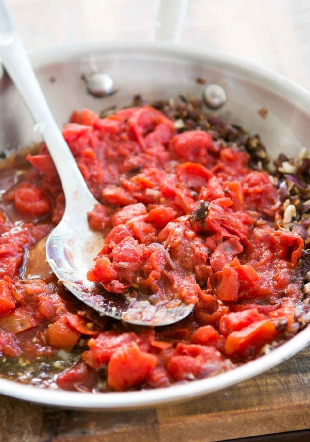 - Add the tomatoes and any juice in the can. Increase the heat to medium, and cook for 5 to 6 minutes, stirring frequently, until the mixture is thick and still juicy, but not runny. Turn off the heat and add the cilantro. Set aside. (The sauce can be refrigerated for up to five days in advance.)