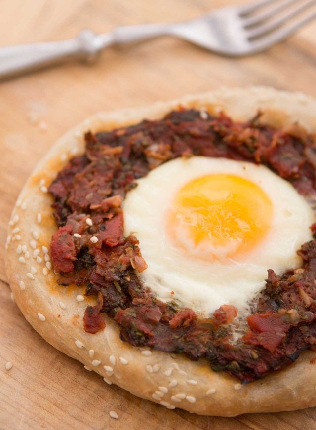 When I pulled theย breads out of my oven aroundย lunchtime, the smell of the spicy sauce and yeasty bread made me want toย dive right in. Which I did, taking a bite of the freshly baked rounds smothered in spiced tomato sauce, with the soft yolk spilling out over the warm, sesame-seeded bread. I immediately forgot how hard I had worked holding that third plank pose our Pilates teacher made us do (which is part of the reason my midsection is really being especially stubborn) and quickly polished it off. Then I reached for another.