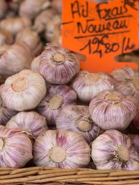 Garlic has a season, and depending on where you live, that season is usually spring through mid-summer. In France, we get ail nouveau, which are heads of garlic that are very plump and slightly soft, whose moist skin is tinged with a bit of pink. As it ages, the garlic becomes more rosy in color, and there is even a special โroseโ garlic in France called ail rose de Lautrec, whose status is certified by the French government. As the months progress, garlic season ends and the remaining heads go into storage.