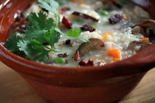 I have no idea why this rice soup goes by several names, but I learned to make it when I worked in a restaurant that served southeast Asian and Chinese food, back in San Francisco, from one of my co-workers. (She told me jook mean โarcherโ in Chinese, which had some connection to the dish, but I donโt recall exactly why.) No matter what you call it, itโs a simple, nourishing soup/porridge made from rice. You can add whatever you like to it; dried (soaked in hot water until soft) or fresh mushrooms, crisp or soft bacon, meat, shrimp, and frozen or fresh vegetables like peas and carrots. The fresh ginger gives it some zip but if you donโt have it (and yes, I know itโs not the same flavor) but some dried ground ginger will liven it up. I like a hint of fish sauce stirred into it, too.