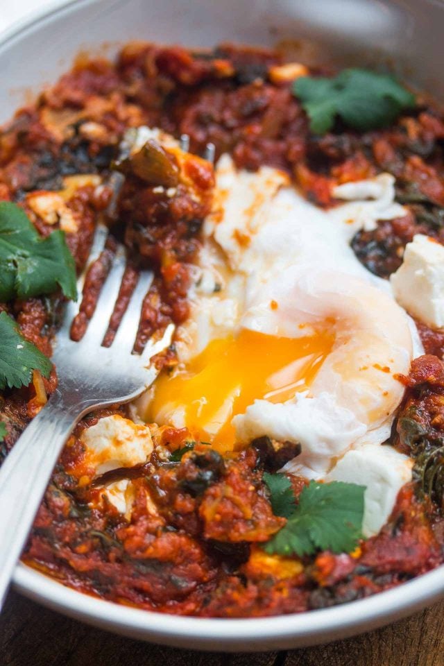 My favorite way to turn canned tomatoes into a one-pan breakfast, or dinner: Shakshuka! Spices give these baked eggs an extra kick, and you can make the base in advance. I like it best with runny eggs, but you can cook the eggs longer than the softly cooked ones shown here if people in your household like their more cooked. Just be careful as they can go from soft, to overcooked, in less than a minute.