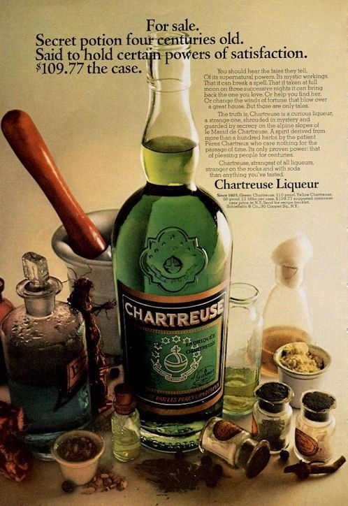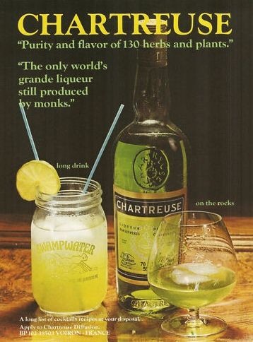 Swampwater came out around the time of Harvey Wallbangers, Rusty Nails, Stingers, and Slow Comfortable Screws. Chartreuse was also having a bit of a hey-day. The mystery of the monks brewing it up in the French alps was played up, but I doubt that these days, you could sell something by using the line, โโฆstranger of all liqueurs, stranger on the rocks with soda than anything youโve tasted.โ