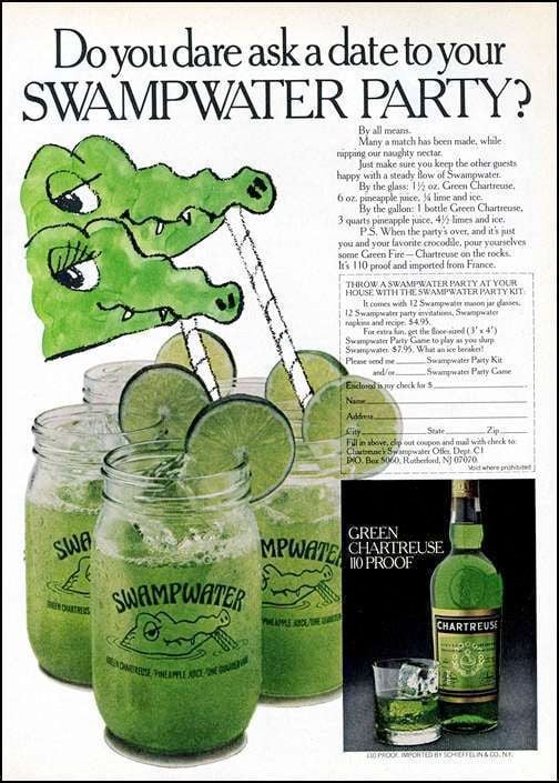 When I had Tim Master on my IG Live, talking about Chartreuse, one drink he mentioned making was the Swampwater. I was a little young when some of the following ads came out, but I vaguely remember the name, Swampwater.