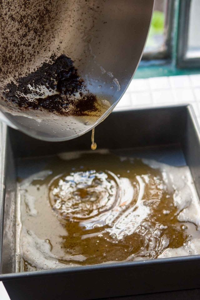 - Preheat the oven to 350ºF (180ºC.) Melt the butter in a skillet, watching it carefully and swirling it gently. When it starts to take on a light brown color and smells a little nutty, and the bubbles begin to subside, pour the browned butter into an 8-inch (20cm) square baking pan, leaving the blackened bits back in the skillet.