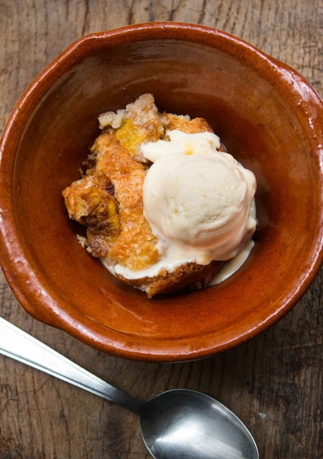 Peach Cobbler has become the most requested dessert around here this summer. I don’t think Romain had ever had a cobbler – I usually make crisps, which the French call crumbles. But I’ve been revisiting some cookbooks on my shelf that I hadn’t used for a while and pulled down The Pastry Queen by Rebecca Rather, who was the owner of several bakeries in Texas.