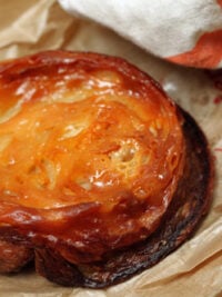 Iโve been to Brittany numerous times and had plenty of Kouign amann, which means โButter Cakeโ in Breton. But since theyโre not Parisian (like me), theyโre either too-fancy, or too restrained (unlike me) with the butter and caramel, which leaves me craving the real thing even more. But this one, this impeccably-slick disk was practically talking to me from the shelf at the shop. I kid you not. I was taping a television segment there and I could barely wait for the camera to stop before I could swoop down on one.