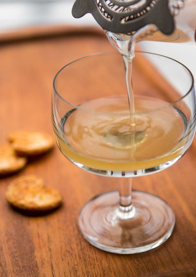 - Fill the shaker 3/4s full with ice, cover, and shake until well-chilled, about 15 to 20 seconds. Strain into a chilled coupe glass.