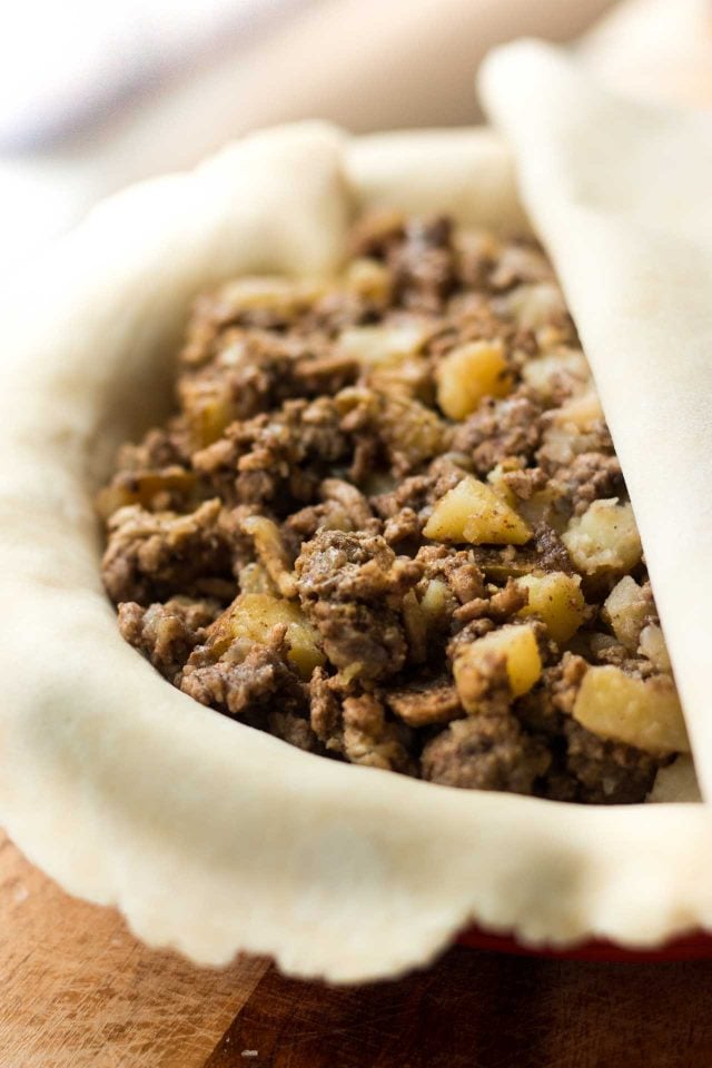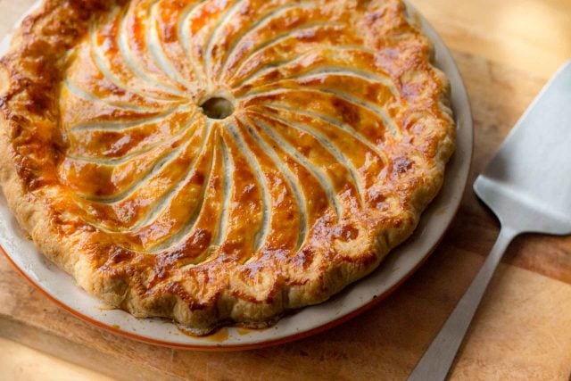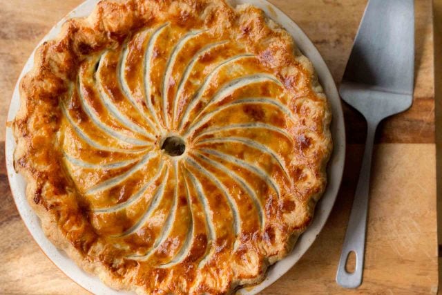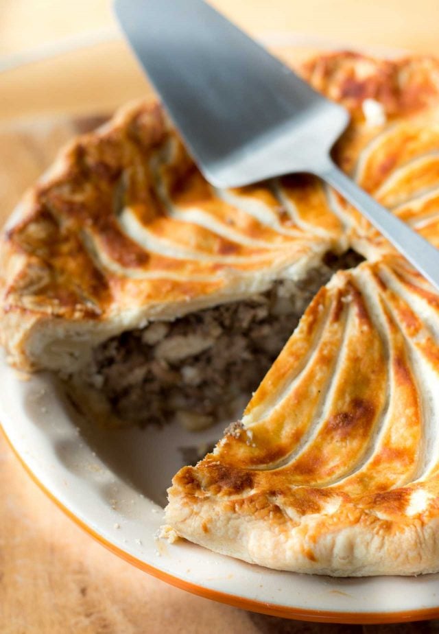 This Tourtiรจre may look complicated, but itโs actually quite easy to make. If you can make an apple pie, you can make this savory tourte. With its pleasing mix of spices, and just-right richness, itโs a great, warming meal on a cold winter night paired with some vegetables or a salad, and a glass of wine, to keep your spirits high. There are a few steps, but the ingredients are easy to find, and you can make the dough at your leisure, then assemble it when the mood โ or hunger โ strikes, enclosing the filling in the buttery layers of pastry, then, an hour later, present this beautiful tourtiรจre to everyone for dinner.
