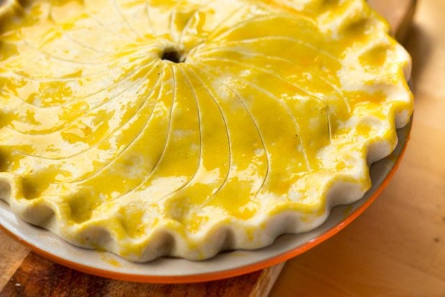 - To bake the tourtiรจre, preheat the oven to 375ยบF (190ยบC). Brush the egg yolk over the top of the pie dough, cut a hole in the center, and make any decorative marks you wish in the top with the tip of a sharp paring knife. Bake the pie until the top is golden brown, about 45 to 50 minutes. If necessary, you can run the pie under the broiler a minute or so to get it to brown nicely. Let cool 10 minutes before serving.