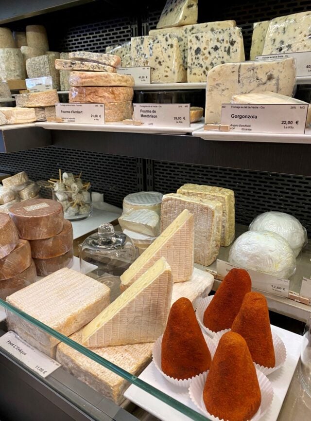 Though these fromageries are quite possibly the priciest in Paris, this is where I go when I want a one-of-a-kind cheese or if Iโm looking for the very best cheese that France has to offer. I suggest taking your time and asking questions. They welcome cheese-loving visitors from all over the globe, so the staff are multilingual and have been expertly trained to help you put together the perfect cheeseboard, or choose cheeses to vacuum seal (sous-vide) to take home with you.ย