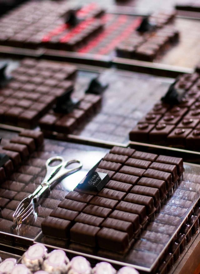 Their most famous bonbons are the seriously-rich, ganache-filled palets dโOr flecked with bits of real gold. At the shop, they barely have time to keep them in the showcase, as customers come in, the saleswomen fill boxes directly from the decades-old wooden storage trays.