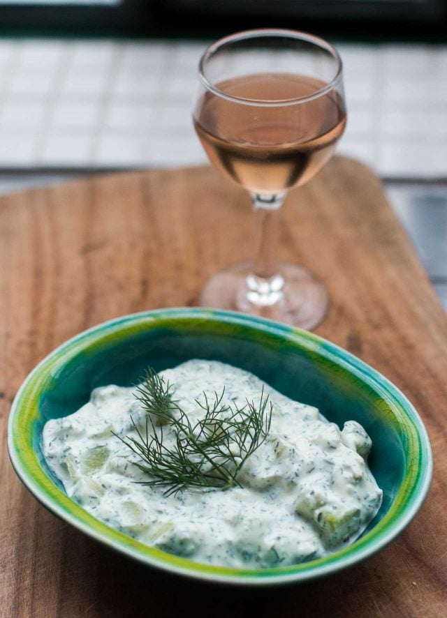 There are lots of variations on Tzatziki; some recipes have you grate the cucumbers and others call for plain yogurt, which I find a bit runny, so I use Greek yogurt. If you can only get plain yogurt, use a full-fat variety and drain it in a mesh strainer lined with cheesecloth for a few hours in the refrigerator, as you would make Labneb. It was also time to break out the rosรฉ and the Tzatziki made an appearance as an appetizer that evening.