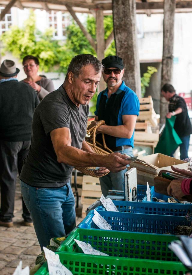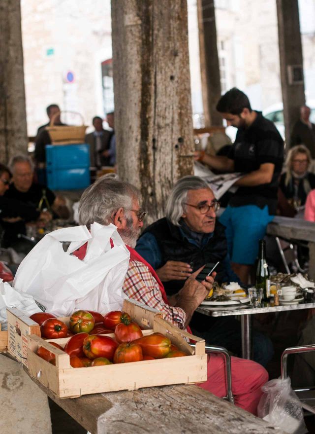 Market shopping in France also means taking time for a pause cafรฉ, with the vendors (and shoppers) downing a cafรฉ express to keep themselves well-fueled. I decided to hold out for wine, eying the platters of oysters and glasses of wine that other shoppers had already started on.