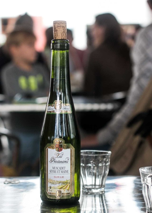 Ditto with oysters. For some reason, white is okay (and healthy?) to consume with bivalves, so I didnโt have to do any arm-twisting to get everyone on board with a bottle of Muscadet, a wine thatโs been becoming more and more appreciated in the U.S.ย (I think it got a bad rap as people associated it with Muscat, a grape often made into sweet wine.) Even though the Muscadet the cafรฉ had wasnโt a top-of-the-line bottle, it was much appreciated with the oysters.