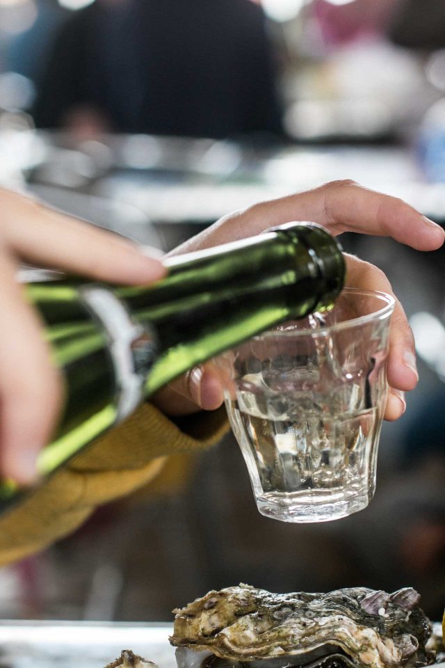We found seats amongst the crowd and ordered a bottle of Muscadet, while Romain headed over to the rugged รฉcaillier to order some oysters, and check out what else he had to offer.