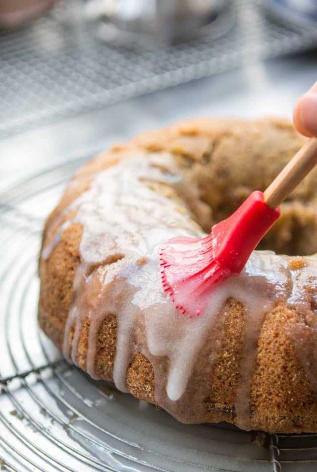 - Let the cake cool for 10-15 minutes, then carefully invert it onto a cooling rack. Brush the glaze over the cake with a pastry brush and let the cake cool completely.